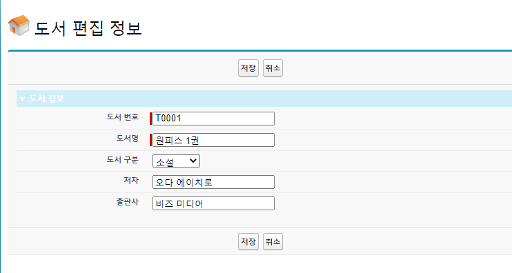 | 구분 | BookType__c | 선택 목록 | 시,소설,수필,자서전 | |