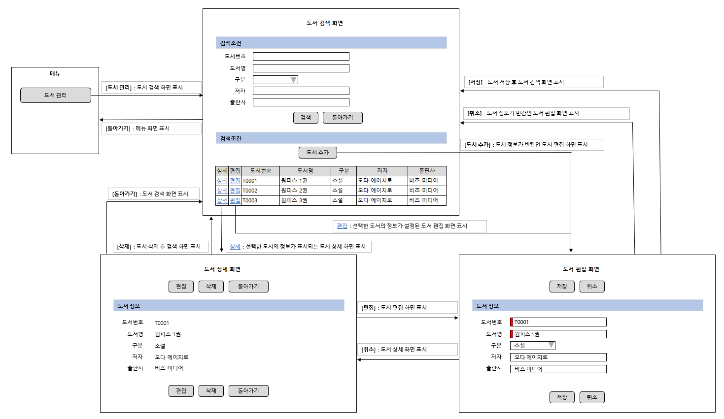 이번 도서 관리 프로그램 다음과 같은 화면으로 구성할 예정입니다.
