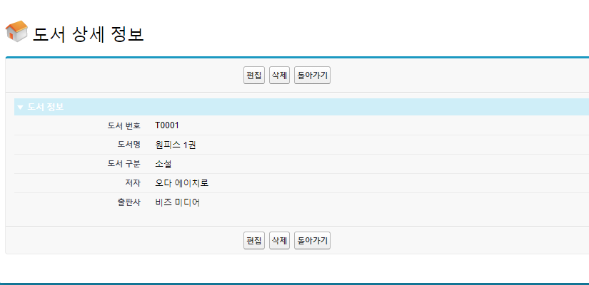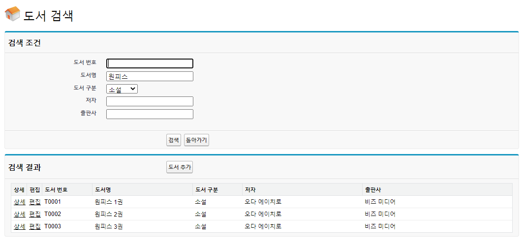 이상으로 간단히 도서를 검색, 참조, 등록, 수정, 삭제 할 수 있는 도서 관리 프로그램을 만들어 보았습니다.