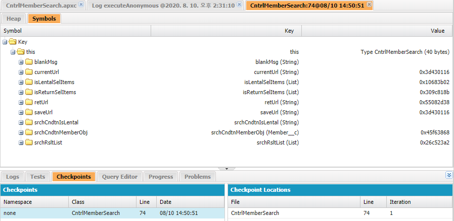 Apex 코드 내에서 CheckPoint(Break point)를 지정하여 특정 지점에서 일어나고 있는 상태를 볼 수 있다.
