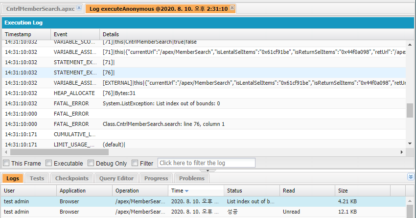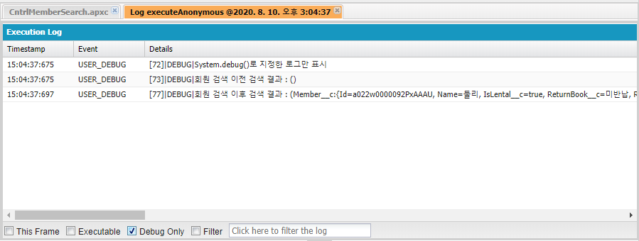 또한, 개발자 코드의 로그에서 [Debug only]를 체크하면 Apex 코드 내에서 지정한 로그만을 표시하는 것이 가능하다.