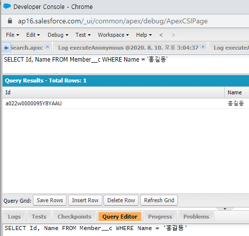 SELECT Id, Name FROM Member__c WHERE Name = '홍길동'