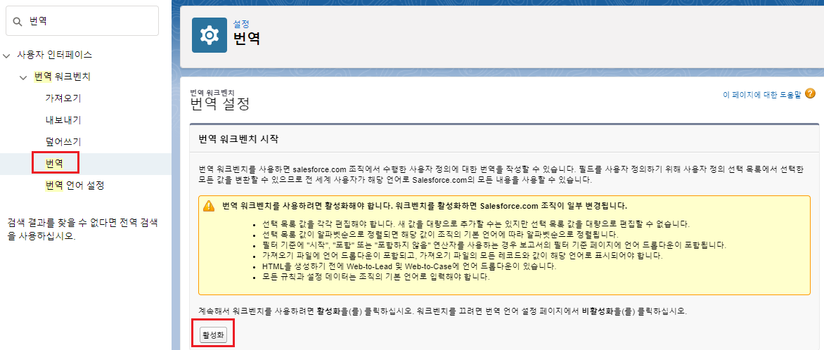 그 후, [활성화] 버튼을 눌러 사용자 정의 라벨의 번역 기능을 활성화 합니다.