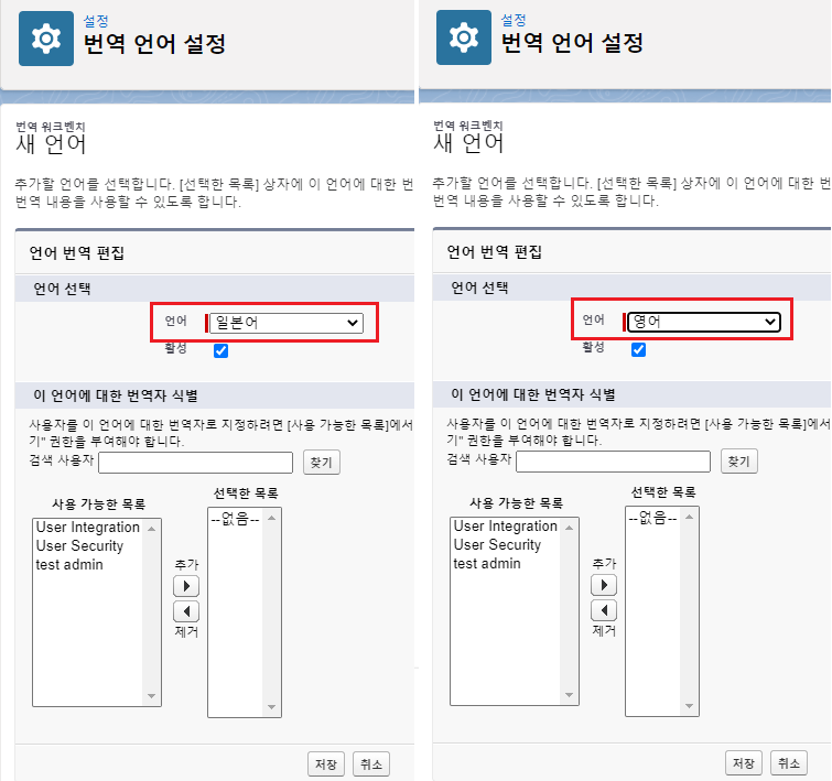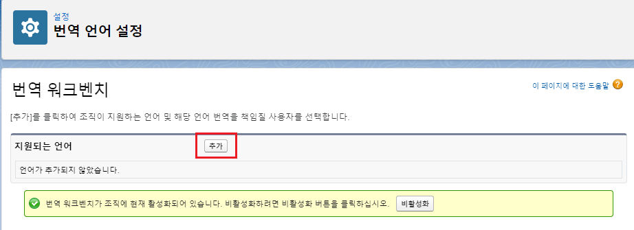 번역 기능이 활성화 되면 "번역 언어 설정" 화면이 자동으로 표시되며, 이 곳에서 사용자 정의 라벨에서 번역 기능을 추가할 언어를 설정해주어야 합니다. [추가] 버튼을 눌러 언어를 추가합니다.