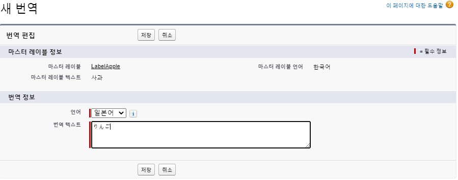 번역란에서 [새로 만들기] 버튼을 클릭해 "번역 편집" 화면을 표시, 번역할 정보를 입력한 뒤 [저장] 버튼을 눌러 사용자 정의 라벨의 번역 정보를 저장합니다.