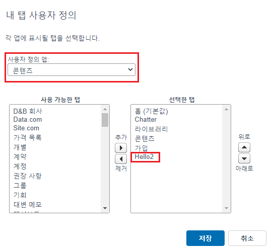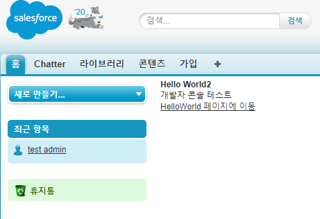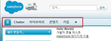 여기서 탭이란 홈, Chatter, 라이브러리 등이 표시되어 있는 부분을 탭이라고 합니다.