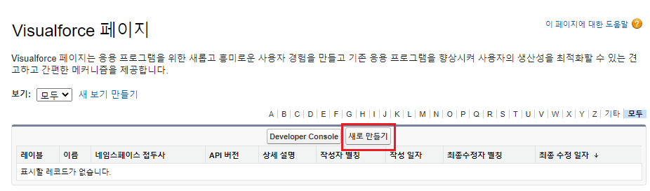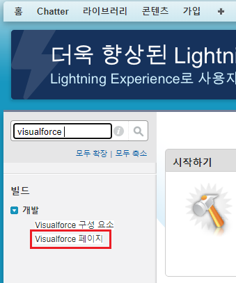 그 후, 화면 왼쪽에 있는 메뉴에서 [개발 -> Visualforce 페이지] 를 클릭하거나 또는 [빠른 찾기/검색] 란에서 "Visualforce 페이지" 를 입력한 후 표시되는 [Visualfoce 페이지] 링크를 클릭해 "VIsualforce 페이지" 화면을 표시합니다.