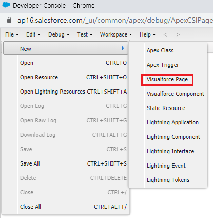개발자 콘솔창이 열렸다면 [File - New - Visualforce Page]를 누른 후, 페이지명을 입력하고 [OK]버튼을 눌러줍니다.
