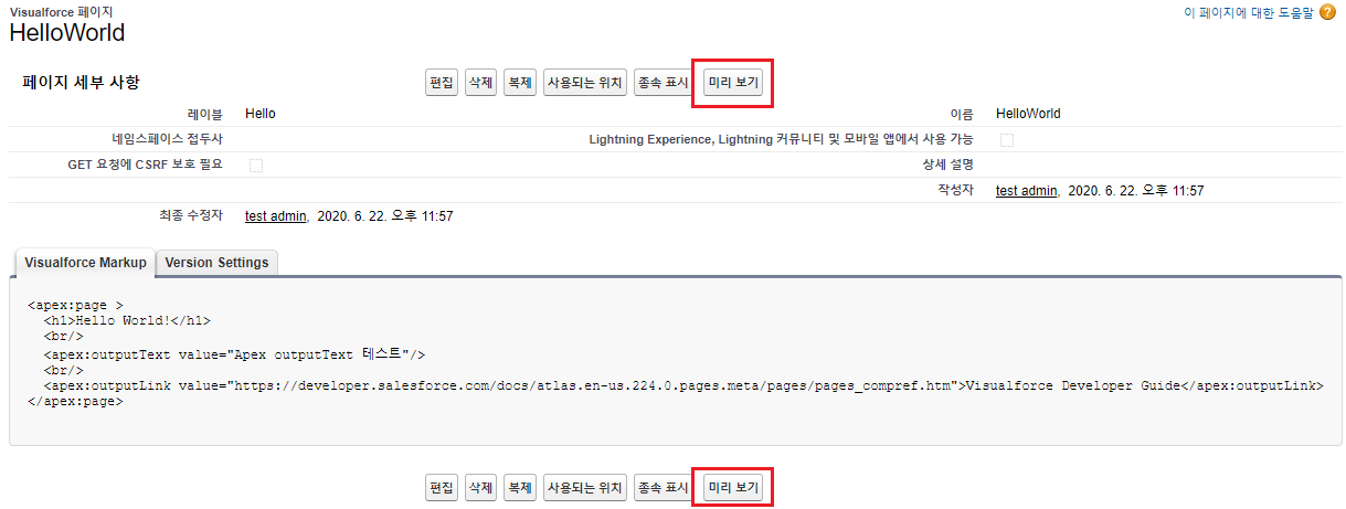 저장이 완료되면 아까와 같이 [설정 - 개발 - Visualforce 페이지] 을 클릭해 Visualforce 페이지로 이동한 후, 방금 작성한 "Hello World2" 페이지의 상세 화면을 표시합니다.