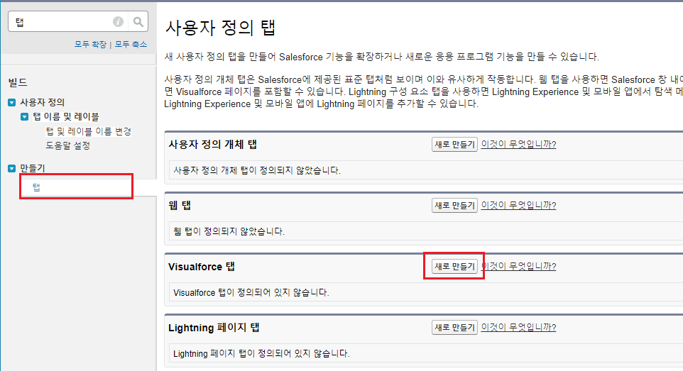 그럼 생성을 위해 [설정 - 빌드 - 만들기 - 탭] 링크를 클릭하거나, [빠른찾기/검색] 에서 탭을 입력하여 [탭] 링크를 클릭합니다.