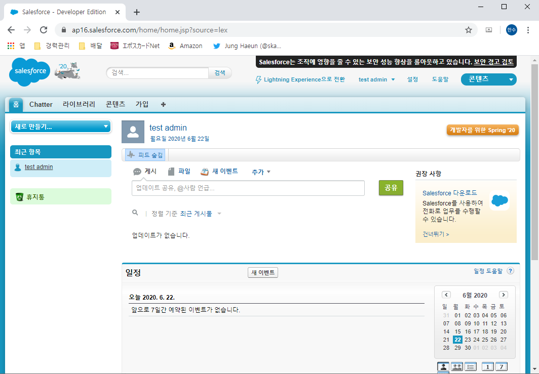 아래의 화면이 Salesforce Classic의 홈 화면입니다.