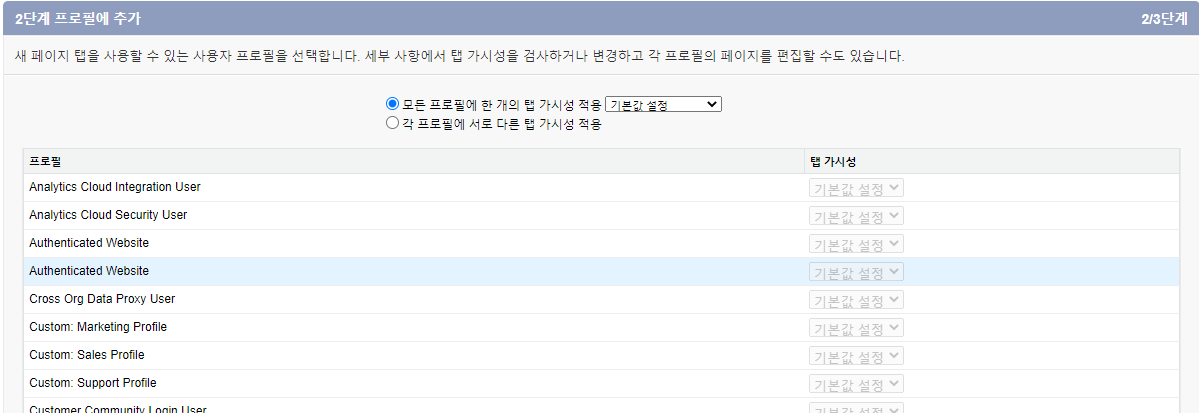 그 다음에 표시되는 "2단계: 프로필에 추가" 는 이 탭을 사용할 수 있는 권한을 지정하는 화면입니다.