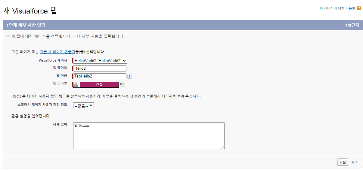 새 Visualforce 탭 화면이 표시되면 아래와 같이 입력한 후 [다음] 버튼을 누릅니다.