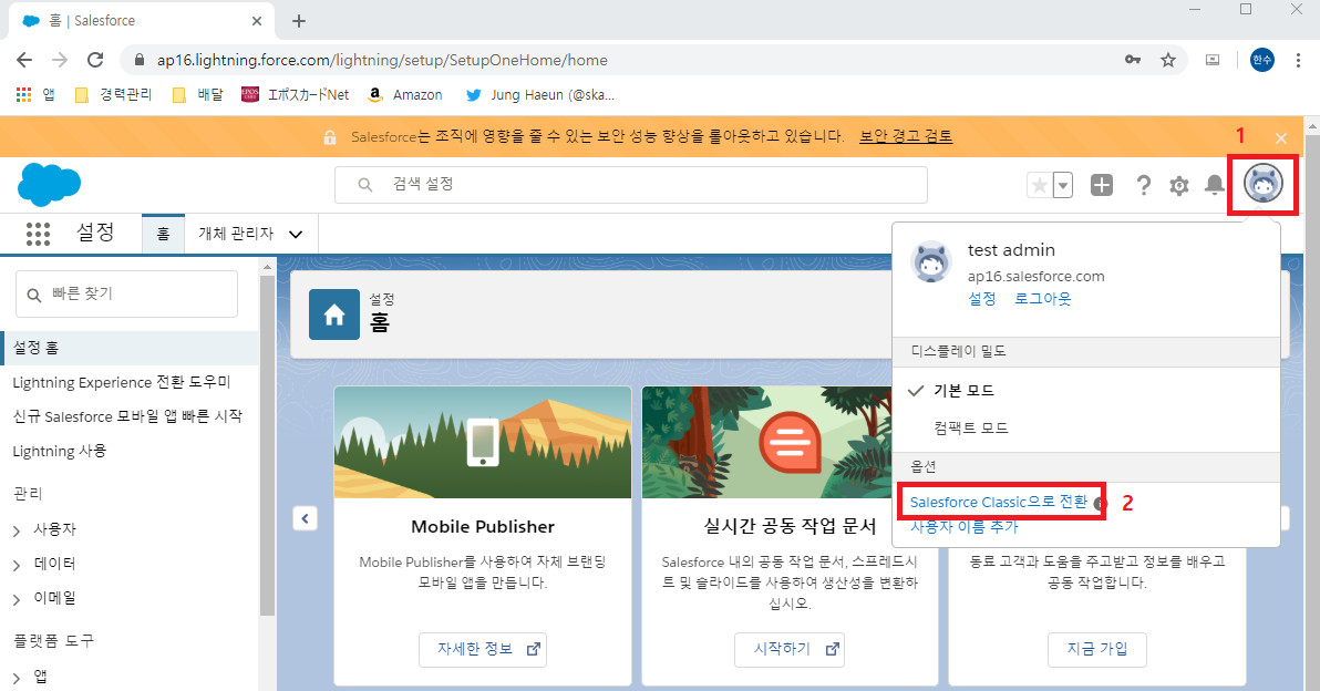 화면 오른쪽 위에 있는 아이콘 모양을 눌러 [Salesforce Classic으로 전환] 링크를 눌러줍니다.