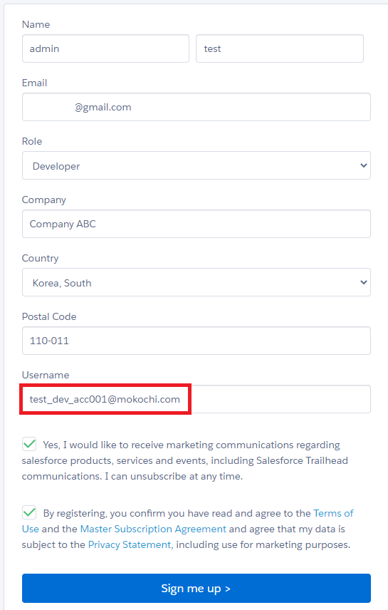 입력이 끝난 후, 맨 밑에 있는 [Sign me up] 버튼을 누르면 [Email] 항목에 입력한 메일 주소로 계정 확인 메일이 날아옵니다.