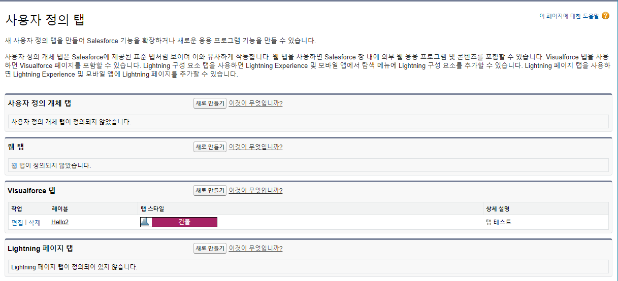 그 후, 사용자 정의 탭 화면의 Visualforce 탭 세션에 있는 [새로 만들기] 버튼을 클릭해 "새 Visualforce 탭" 화면을 표시합니다.