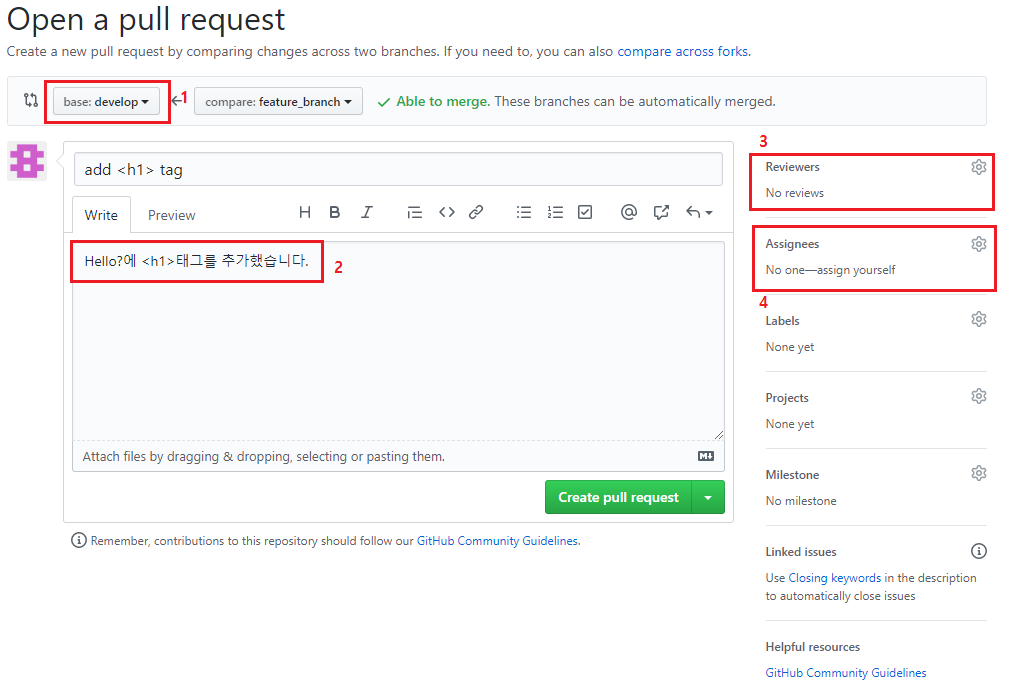 입력이 끝났다면, "Create pull request"버튼을 눌러 Pull Request를 요청해줍니다.
