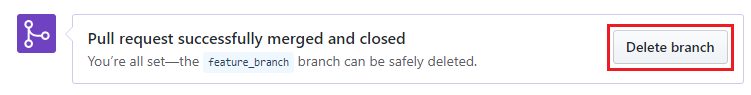 병합이 완료되면, "Delete branch"버튼을 눌러 필요가 없어진 feature_merge를 삭제해줍니다.