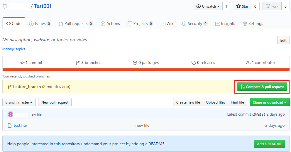 사진과 같은 노란색 블록이 표시되었다면, 오른쪽에 "Compare & pull request" 버튼을 눌러 "Open a pull request"화면을 표시합니다.